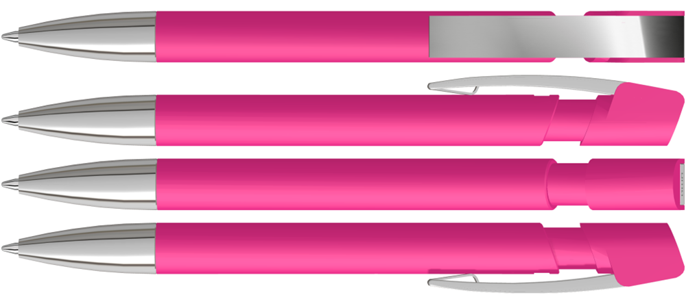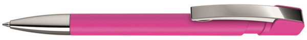 Druckkugelschreiber mit Softtouch-Gehäuse, flexiblem Metallclip und schwerer Metallspitze glanzverchromt.