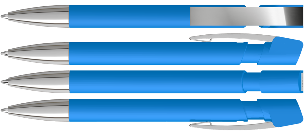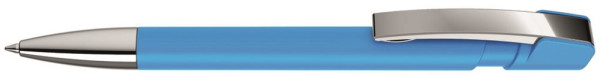 Druckkugelschreiber mit Softtouch-Gehäuse, flexiblem Metallclip und schwerer Metallspitze glanzverchromt.