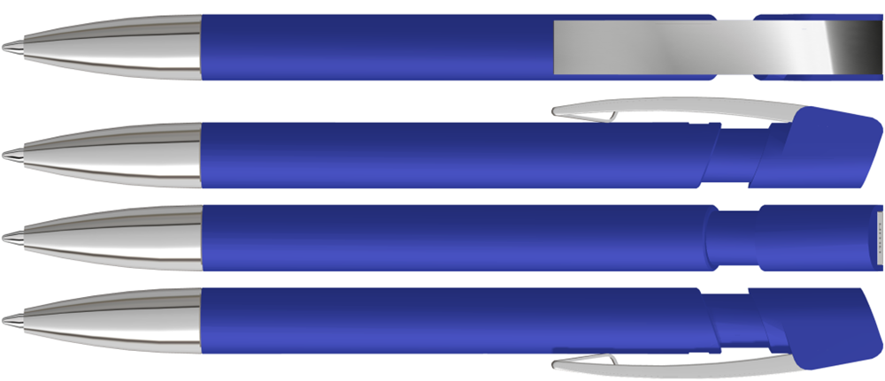 Druckkugelschreiber mit Softtouch-Gehäuse, flexiblem Metallclip und schwerer Metallspitze glanzverchromt.