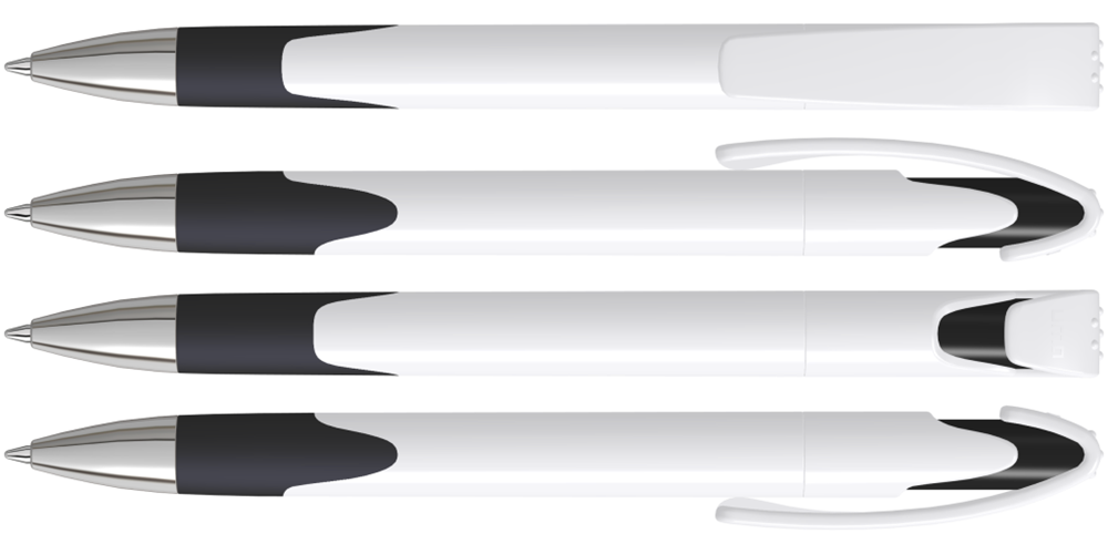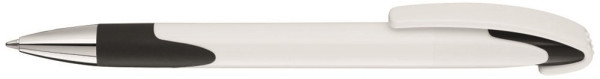 Druckkugelschreiber mit gedeckt glänzendem Gehäuse, Gummigriffzone und schwerer Metallspitze glanzverchromt.
