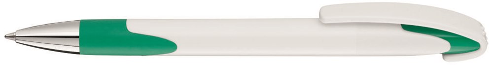 Druckkugelschreiber mit gedeckt glänzendem Gehäuse, Gummigriffzone und schwerer Metallspitze glanzverchromt.