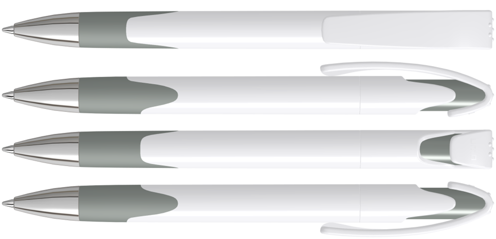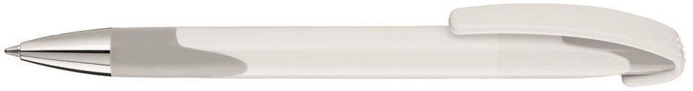 Druckkugelschreiber mit gedeckt glänzendem Gehäuse, Gummigriffzone und schwerer Metallspitze glanzverchromt.