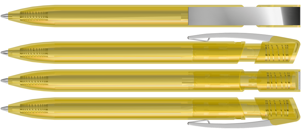 Druckkugelschreiber mit transparent glänzendem Gehäuse und flexiblem Metallclip glanzverchromt. mehr