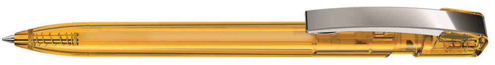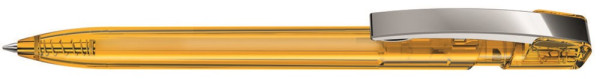 Druckkugelschreiber mit transparent glänzendem Gehäuse und flexiblem Metallclip glanzverchromt.