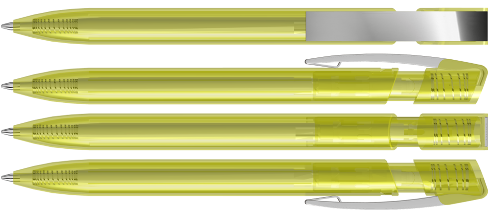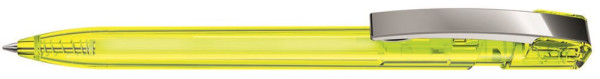 Druckkugelschreiber mit transparent glänzendem Gehäuse und flexiblem Metallclip glanzverchromt. mehr