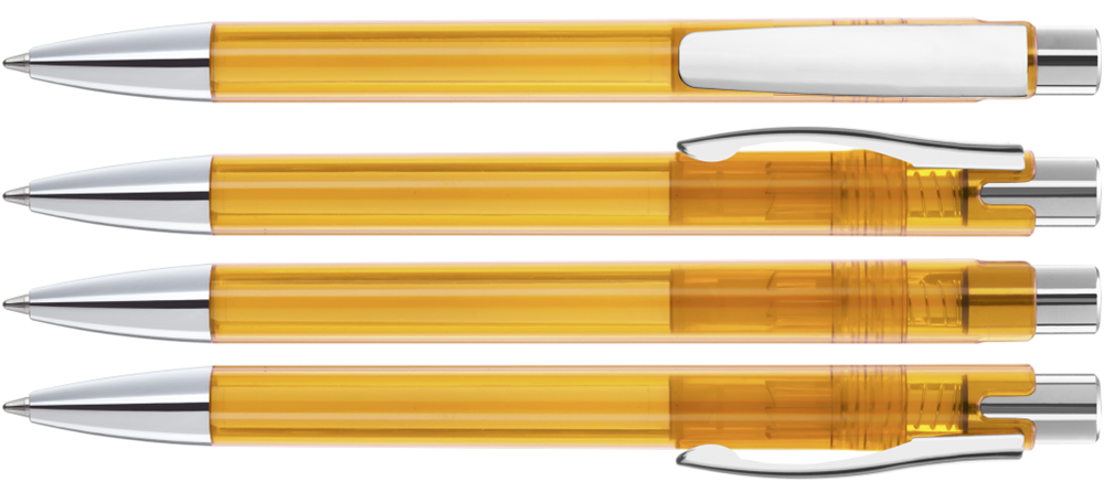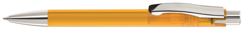 Druckkugelschreiber mit transparent glänzendem Gehäuse, schwerer Metallspitze, Metalldrücker und Metallclip glanzverchromt.