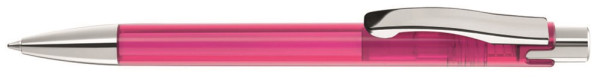 Druckkugelschreiber mit transparent glänzendem Gehäuse, schwerer Metallspitze, Metalldrücker und Metallclip glanzverchromt.