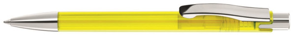 Druckkugelschreiber mit transparent glänzendem Gehäuse, schwerer Metallspitze, Metalldrücker und Metallclip glanzverchromt.