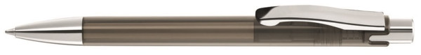 Druckkugelschreiber mit transparent glänzendem Gehäuse, schwerer Metallspitze, Metalldrücker und Metallclip glanzverchromt.