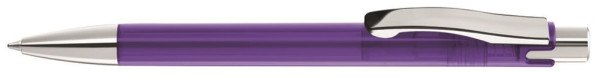 Druckkugelschreiber mit transparent glänzendem Gehäuse, schwerer Metallspitze, Metalldrücker und Metallclip glanzverchromt.