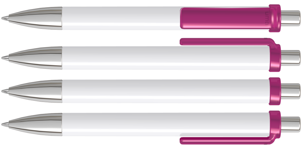 Druckkugelschreiber mit gedeckt glänzendem Schaft, transparent glänzendem Clip, Metallspitze und Metalldrücker glanzverchromt.