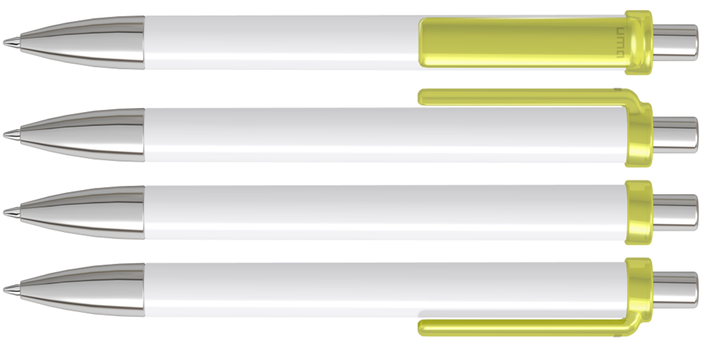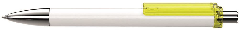 Druckkugelschreiber mit gedeckt glänzendem Schaft, transparent glänzendem Clip, Metallspitze und Metalldrücker glanzverchromt.