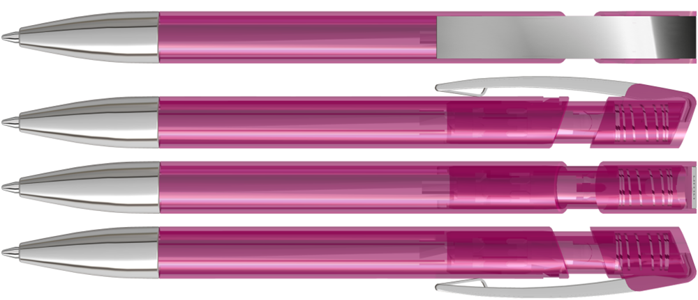 Druckkugelschreiber mit transparent glänzendem Gehäuse, flexiblem Metallclip und schwerer Metallspitze glanzverchromt.