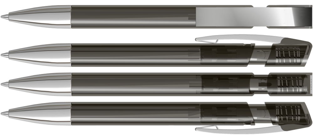 Druckkugelschreiber mit transparent glänzendem Gehäuse, flexiblem Metallclip und schwerer Metallspitze glanzverchromt.