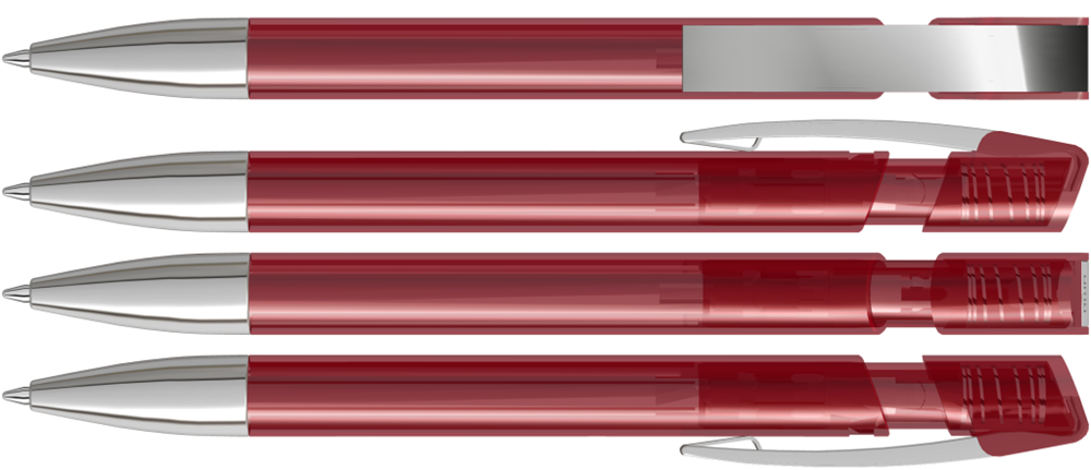 Druckkugelschreiber mit transparent glänzendem Gehäuse, flexiblem Metallclip und schwerer Metallspitze glanzverchromt.