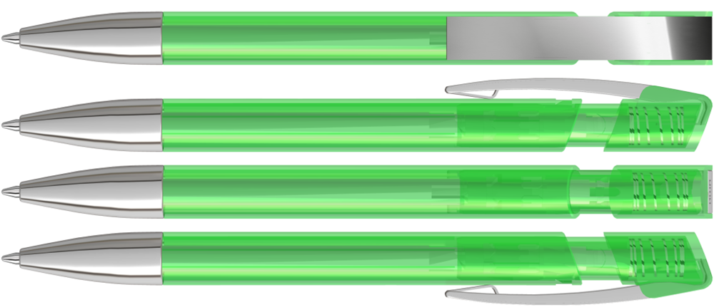 Druckkugelschreiber mit transparent glänzendem Gehäuse, flexiblem Metallclip und schwerer Metallspitze glanzverchromt.