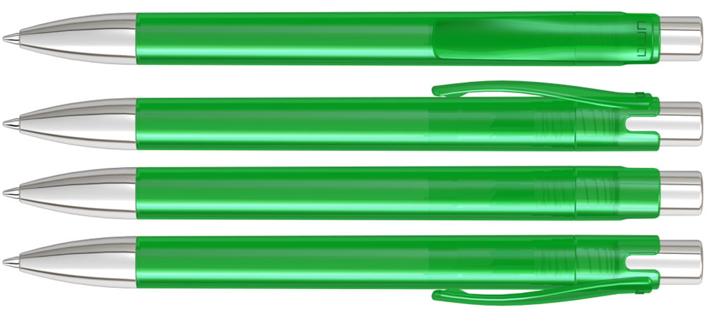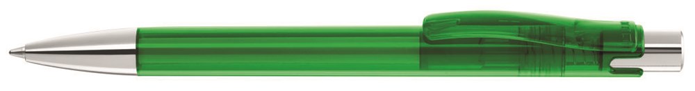 Druckkugelschreiber mit transparent glänzendem Gehäuse, Metalldrücker und schwerer Metallspitze glanzverchromt.