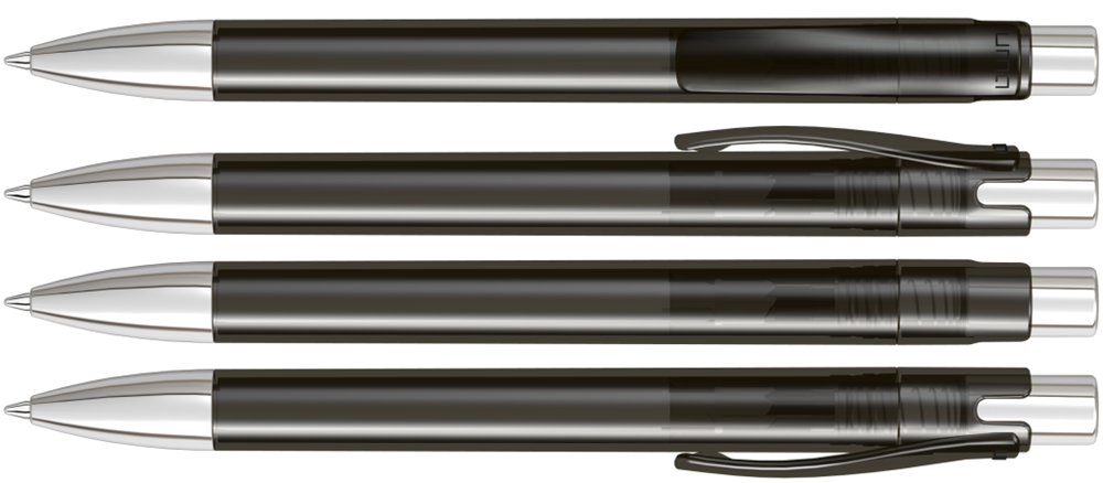 Druckkugelschreiber mit transparent glänzendem Gehäuse, Metalldrücker und schwerer Metallspitze glanzverchromt.
