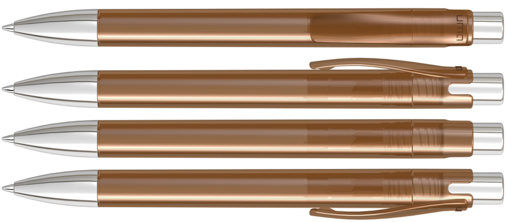 Druckkugelschreiber mit transparent glänzendem Gehäuse, Metalldrücker und schwerer Metallspitze glanzverchromt.
