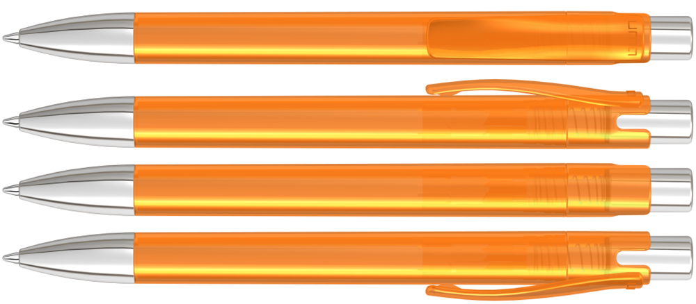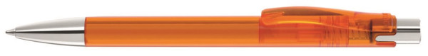 Druckkugelschreiber mit transparent glänzendem Gehäuse, Metalldrücker und schwerer Metallspitze glanzverchromt.