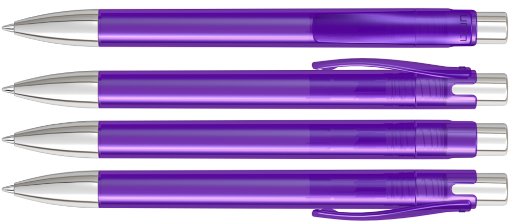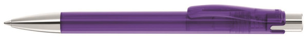 Druckkugelschreiber mit transparent glänzendem Gehäuse, Metalldrücker und schwerer Metallspitze glanzverchromt.