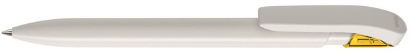 Druckkugelschreiber mit gedeckt glänzendem Gehäuse in uni weiß oder schwarz und farbig transparent glänzende Manschette.