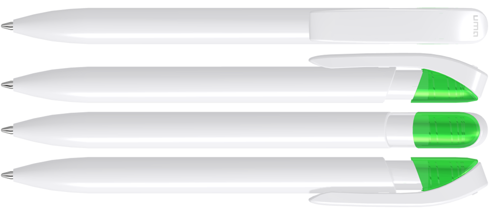 Druckkugelschreiber mit gedeckt glänzendem Gehäuse in uni weiß oder schwarz und farbig transparent glänzende Manschette.