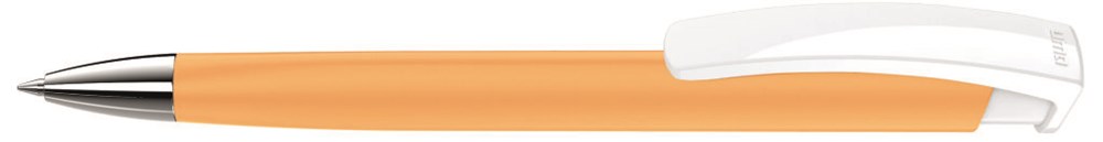 Druckkugelschreiber mit gummiertem Dreikantgehäuse, weiß gedeckt glänzendem Clip und schwerer Metallspitze glanzverchromt.