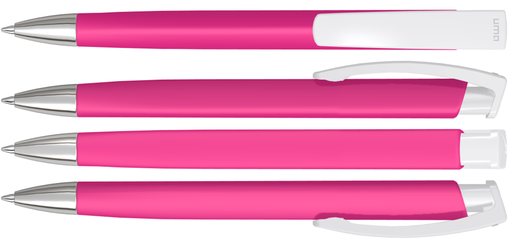 Druckkugelschreiber mit gummiertem Dreikantgehäuse, weiß gedeckt glänzendem Clip und schwerer Metallspitze glanzverchromt.