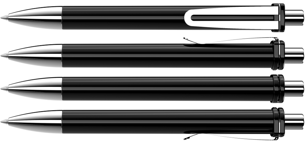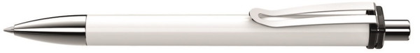 Druckkugelschreiber mit gedeckt glänzendem Schaft und Clipaufhängung. Breiter Metallbiegeclip, Metallspitze und Metalldrücker glanzverchromt.