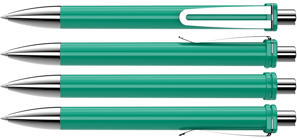 Druckkugelschreiber mit gedeckt glänzendem Schaft und Clipaufhängung. Breiter Metallbiegeclip, Metallspitze und Metalldrücker glanzverchromt.