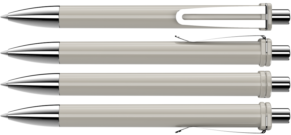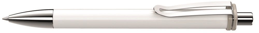 Druckkugelschreiber mit gedeckt glänzendem Schaft und Clipaufhängung. Breiter Metallbiegeclip, Metallspitze und Metalldrücker glanzverchromt.