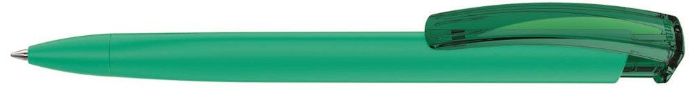 Druckkugelschreiber mit gummiertem Dreikantgehäuse und transparent glänzendem Clip.