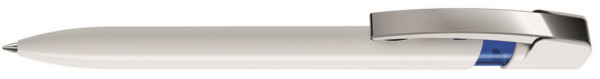 Druckkugelschreiber mit gedeckt glänzendem Gehäuse in uni weiß oder schwarz und farbig transparent glänzendem Cliphals, flexiblem Metallclip glanzverchromt.