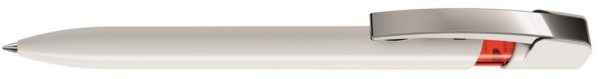 Druckkugelschreiber mit gedeckt glänzendem Gehäuse in uni weiß oder schwarz und farbig transparent glänzendem Cliphals, flexiblem Metallclip glanzverchromt.