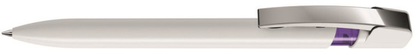 Druckkugelschreiber mit gedeckt glänzendem Gehäuse in uni weiß oder schwarz und farbig transparent glänzendem Cliphals, flexiblem Metallclip glanzverchromt.