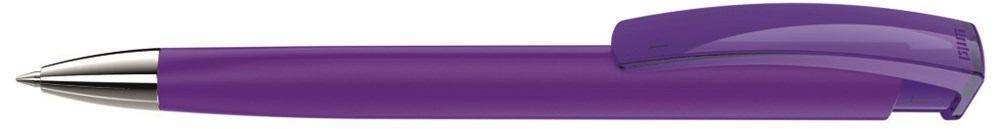 Druckkugelschreiber mit gummiertem Dreikantgehäuse, transparent glänzendem Clip und schwerer Metallspitze glanzverchromt.