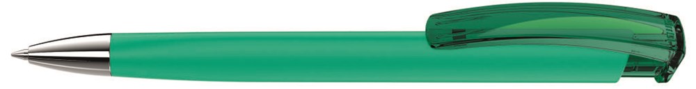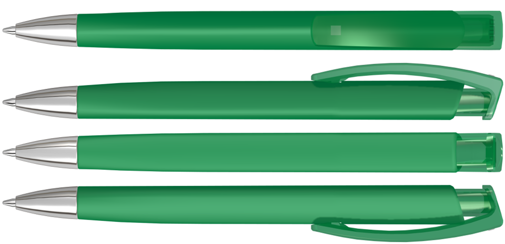 Druckkugelschreiber mit gummiertem Dreikantgehäuse, transparent glänzendem Clip und schwerer Metallspitze glanzverchromt.