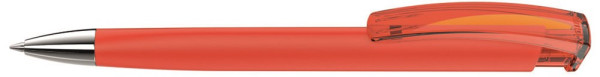 Druckkugelschreiber mit gummiertem Dreikantgehäuse, transparent glänzendem Clip und schwerer Metallspitze glanzverchromt.