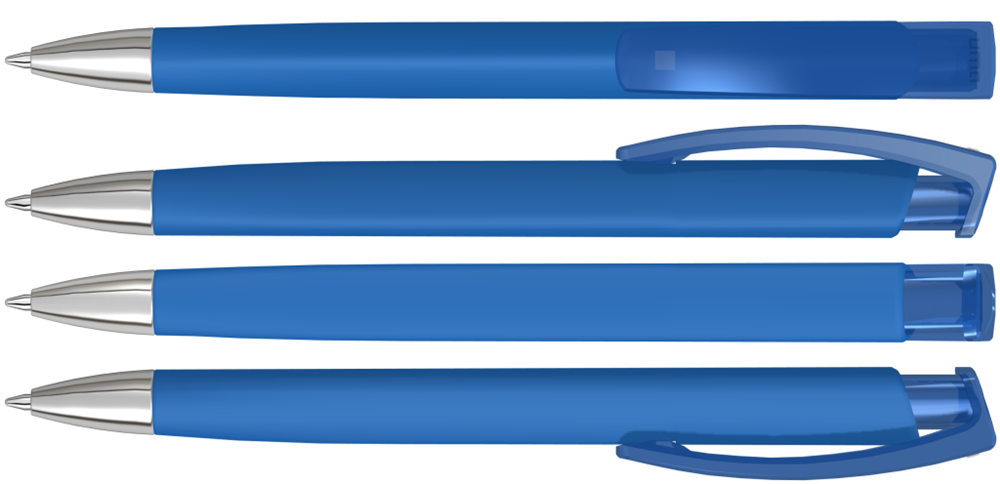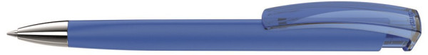 Druckkugelschreiber mit gummiertem Dreikantgehäuse, transparent glänzendem Clip und schwerer Metallspitze glanzverchromt.