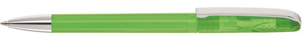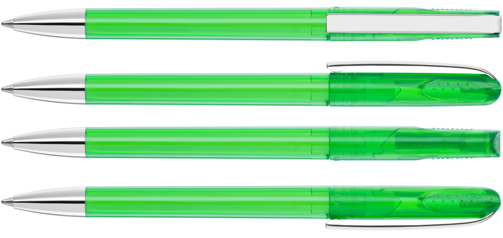 Drehkugelschreiber mit glänzend transparentem Gehäuse, schwerer Metallspitze und Metallclip. Griffnoppen in der Kappe unterstützen den komfortablen Drehmachanismus.