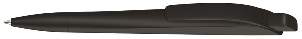 Druckkugelschreiber mit geometrisch wechselnder Schaftform. Gehäuse gedeckt matt schwarz oder weiß mit Bogenclip und farbigem Drücker.