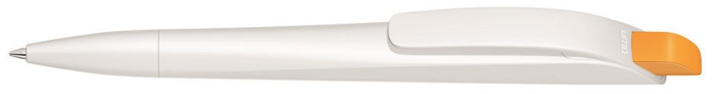 Druckkugelschreiber mit geometrisch wechselnder Schaftform. Gehäuse gedeckt matt schwarz oder weiß mit Bogenclip und farbigem Drücker.