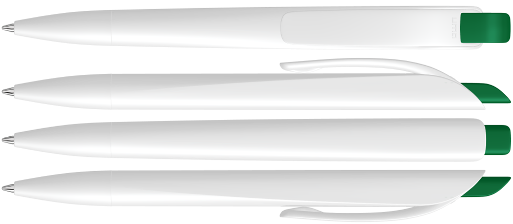 Druckkugelschreiber mit geometrisch wechselnder Schaftform. Gehäuse gedeckt matt schwarz oder weiß mit Bogenclip und farbigem Drücker.