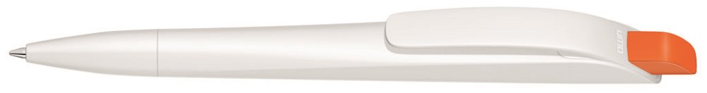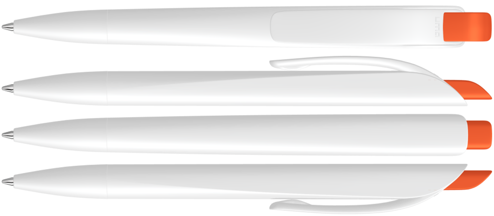 Druckkugelschreiber mit geometrisch wechselnder Schaftform. Gehäuse gedeckt matt schwarz oder weiß mit Bogenclip und farbigem Drücker.
