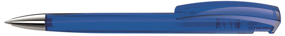 Druckkugelschreiber mit transparent glänzendem Dreikantgehäuse und schwerer Metallspitze glanzverchromt.