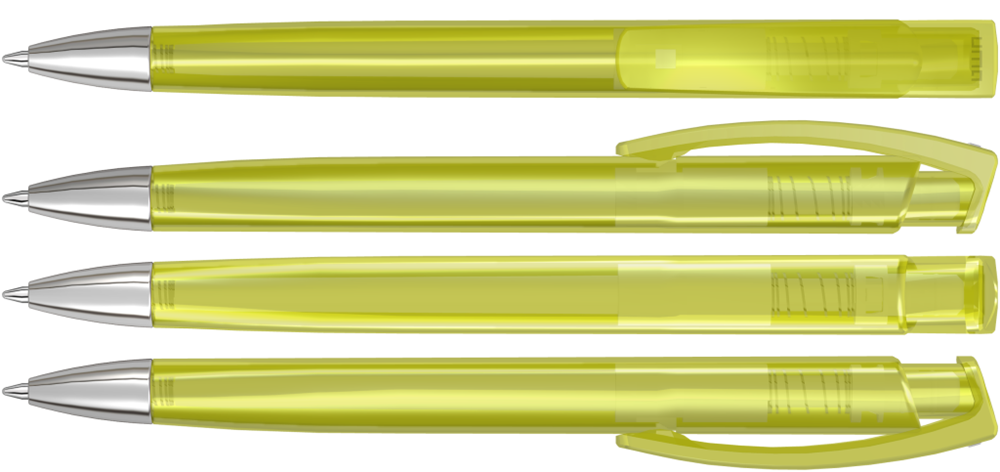 Druckkugelschreiber mit transparent glänzendem Dreikantgehäuse und schwerer Metallspitze glanzverchromt.