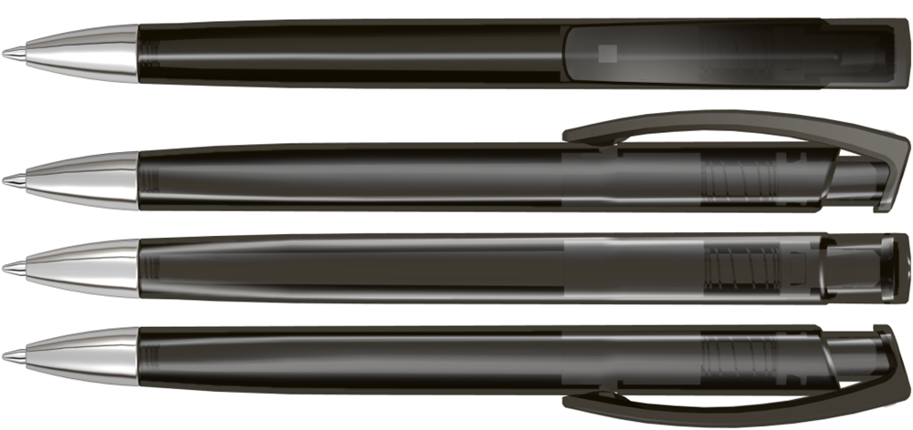 Druckkugelschreiber mit transparent glänzendem Dreikantgehäuse und schwerer Metallspitze glanzverchromt.