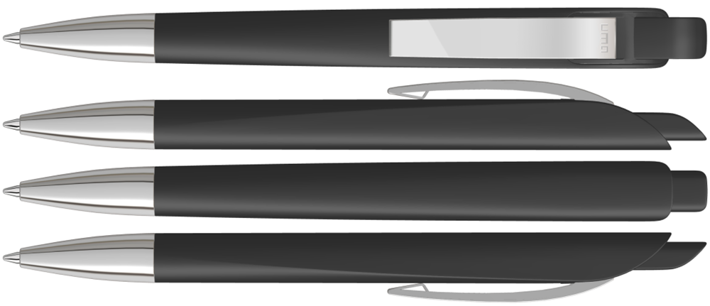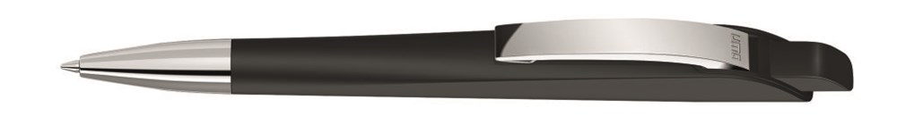 Druckkugelschreiber mit geometrisch wechselnder Schaftform. Gehäuse und Drücker gedeckt matt, Metallclip und Metallspitze glanzverchromt.