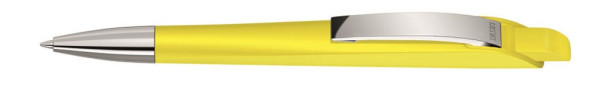 Druckkugelschreiber mit geometrisch wechselnder Schaftform. Gehäuse und Drücker gedeckt matt, Metallclip und Metallspitze glanzverchromt.